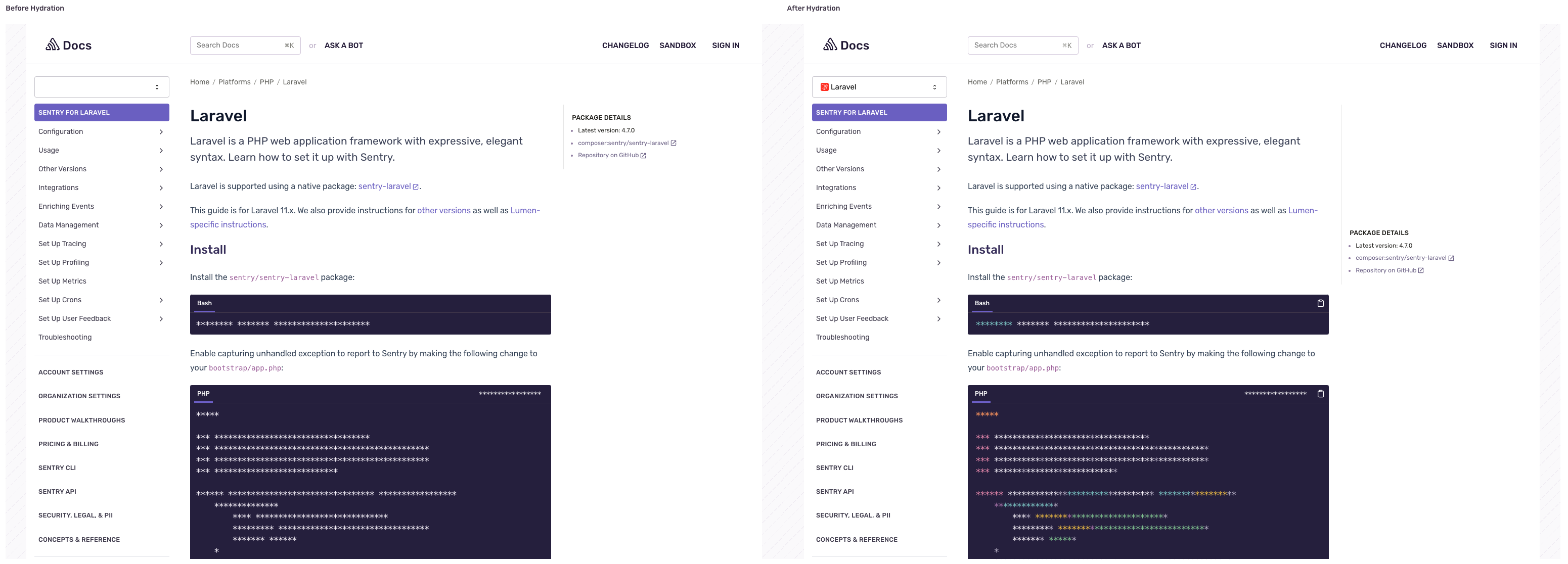 The problem is that code highlighting is not applied on the server. When the server renders the PHP code block in the bottom-center of the page, all the code has a white font color. After hydration syntax highlighting is applied, the code snippet is colorful.