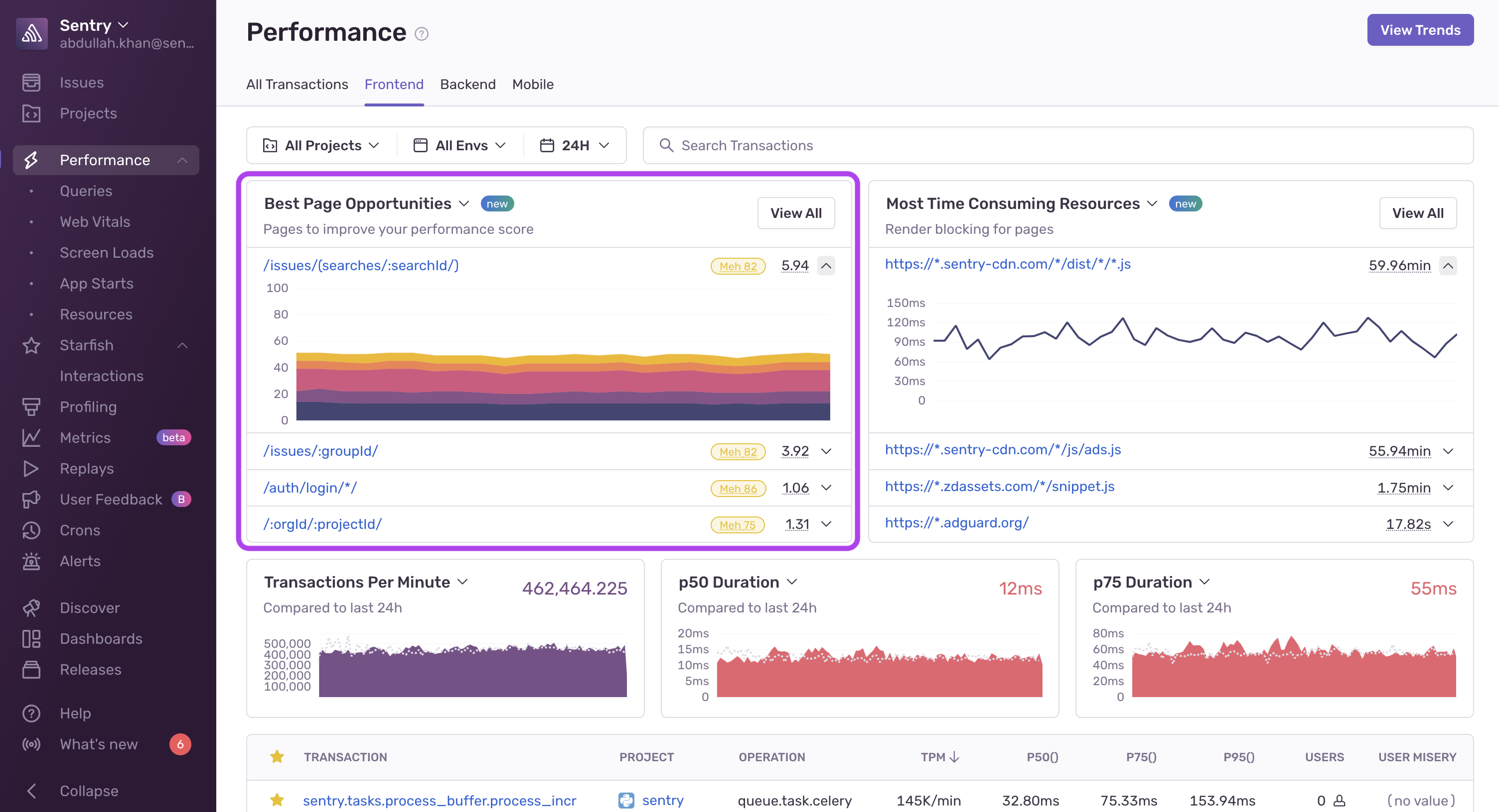 Learn more about Sentry's Performance widgets such as Most Related Issues, Most Regressed Transactions, and Slow HTTP Ops, and how they can be used to surface performance insights in your applications.